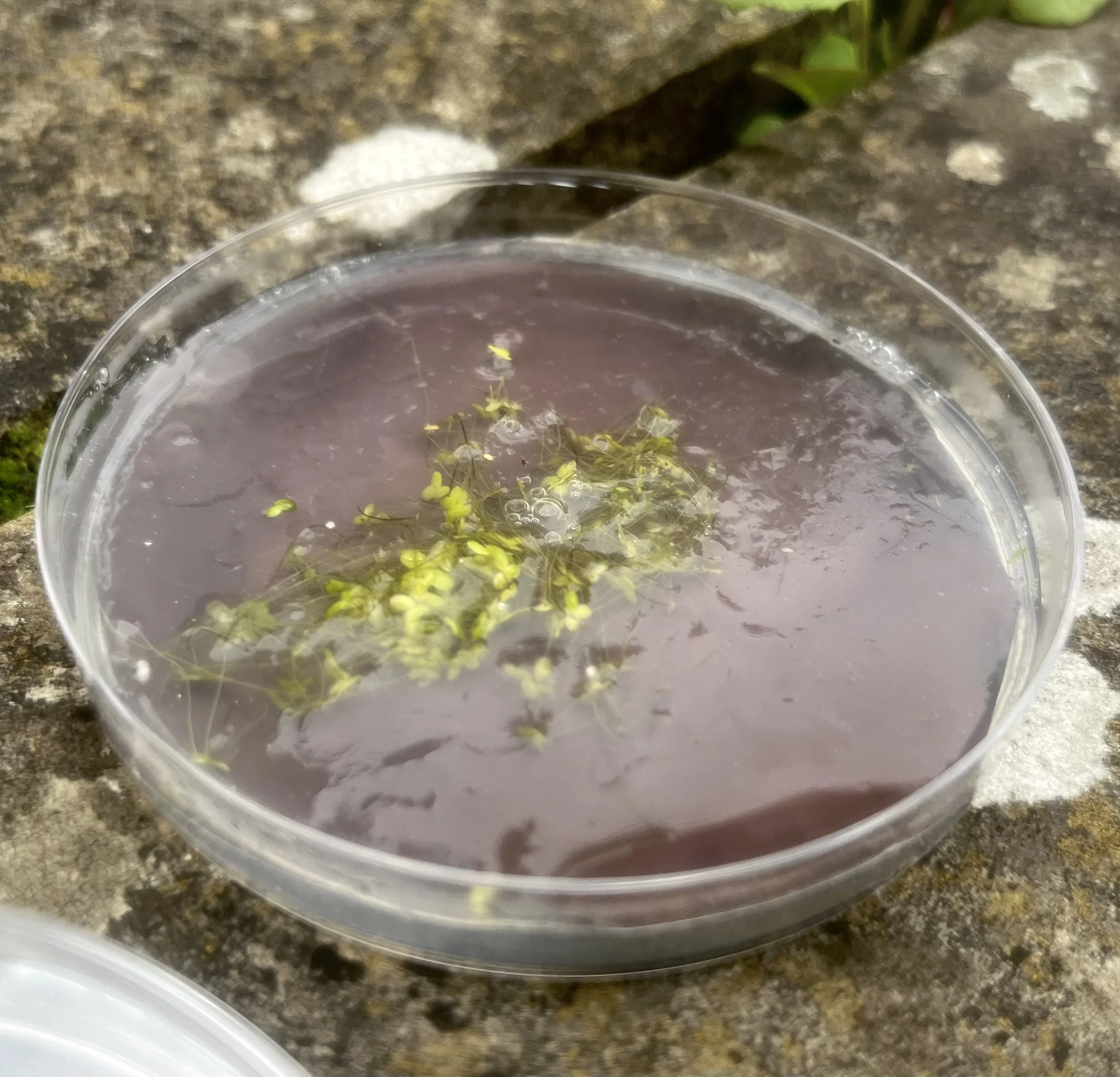 Over 30 year old B/W photographic paper (Agfa) with drops of developer, a layer of agar gelatin and pond water in a Petri dish exposed to daylight. Day 1.